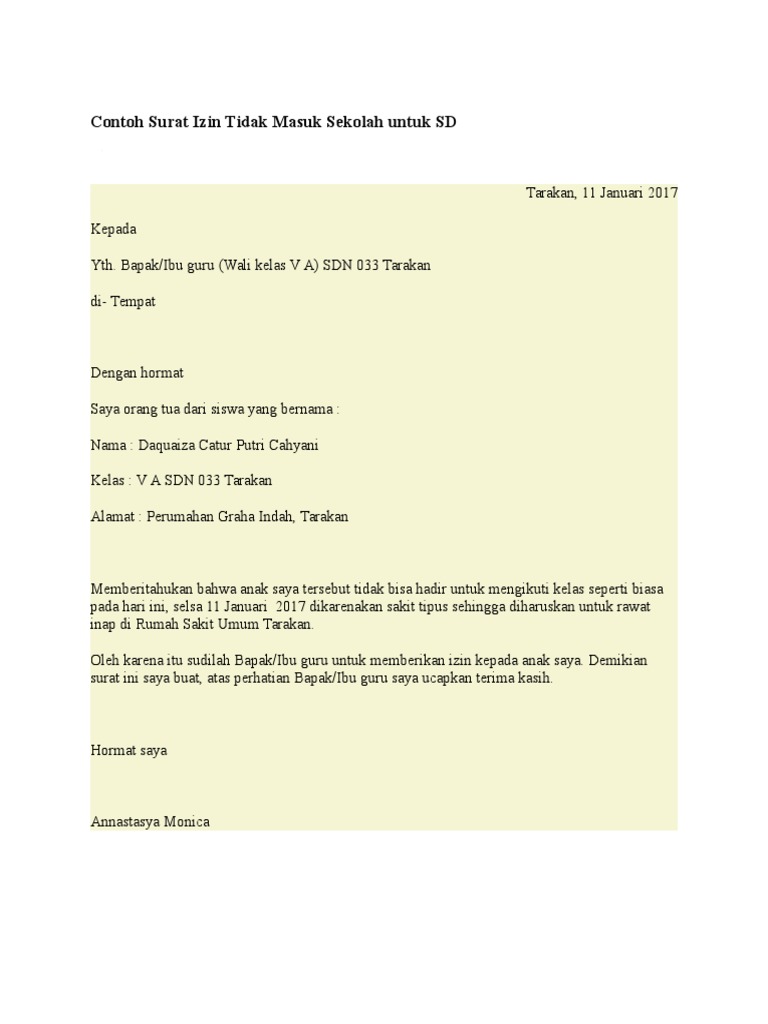 Karena Sakit Contoh Surat Izin Tidak Masuk Sekolah Nusagates from cdn.statically.io Contoh surat izin adalah sebuah surat yang dibuat dengan tujuan untuk meminta izin kepada penerima bahwa sang pengirim memiliki hajat / acara tertentu sehingga tidak bisa hadir atau melaksanakan kegiatan seperti biasanya. Surat izin tersebut tidak harus diketik menggunakan komputer. Penggunaan surat saat ini memang bukan sesuatu yang sering dilakukan lagi. Sakit) sehingga tidak bisa hadir di sekolah untuk mengikuti jika adikmu atau kamu sendiri tidak dapat masuk sekolah karena sakit atau ada keperluan penting, dapat kamu membuat surat izinnya? Namun, tentu saja izin tidak masuk. Berbagai teknologi komunikasi yang semakin berkembang kadang kala, saat anak sakit atau berada dalam kondisi lainnya, anak jadi tidak bisa berangkat sekolah. Semoga uraian dan contoh format dokumen yang kami sediakan tersebut dapat. Oleh karena itu, jika kalian sedang sakit dan tidak bisa mengikuti pelajaran yang ada di sekolah, kalian dapat mengirimkan surat izin kepada pihak sekolah yang bersangkutan.