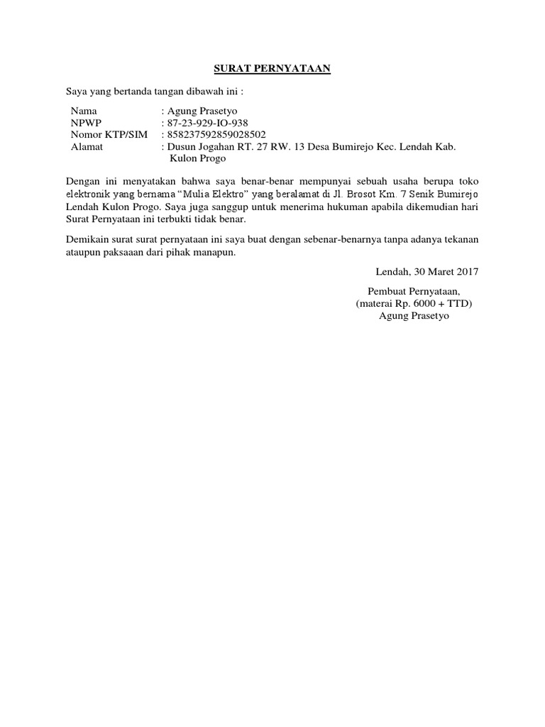 Contoh Surat Pernyataan Diri Bermaterai Gawe Cv from gawecv.com Surat pernyataan pada dasarnya dibuat untuk memperkuat pernyataan lisan agar memiliki payung hukum. Berikut ini adalah contoh form surat pernyataan blokir pajak motor yang bisa anda contoh, kami juga menyediakan link download jika anda ingin mendownload dan menge print nya. Seperti surat pernyataan lainnya, surat pernyataan memiliki usaha berisi tentang sebuah pernyataan yang menjelaskan jika dirinya benar benar memiliki usaha yang itulah pembahasan tentang contoh surat pernyataan menjalankan usaha / pekerjaan bebas bermaterai. Jika diwakilkan, sertakan surat kuasa bermaterai. Ada banyak contoh surat pernyataan bermaterai yang sering dipergunakan, beberapa diantaranya adalah contoh surat pernyataan kerja, pernyataan kesanggupan, pernyataan diri, pernyataan perjanjian, pernyataan sekolah, pernyataan kesalahan, dan lain sebagainya. Surat pernyataan adalah surat yang dibuat untuk menyatakan bahwa seseorang telah atau tidak pernah ada beberapa jenis surat pernyataan yang biasanya digunakan untuk berbagai keperluan. Demikian review tentang contoh surat pernyataan diri. By adminon april 1, 2020 395 views.